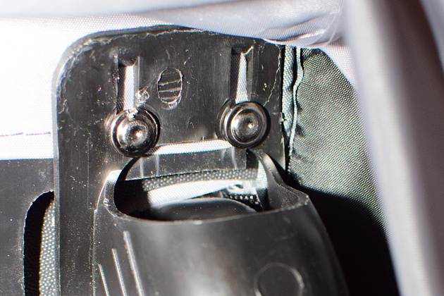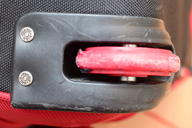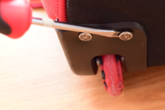 Postup budeme ilustrovat na opravě kufru značky High Sierra. Postup lze však opakovat i pro jiné značky kufrů. Aby bylo možné vložit a utáhnout osičku nového kolečka, bylo třeba vymontovat celé uchycení kolečka, které však bylo přinýtované.