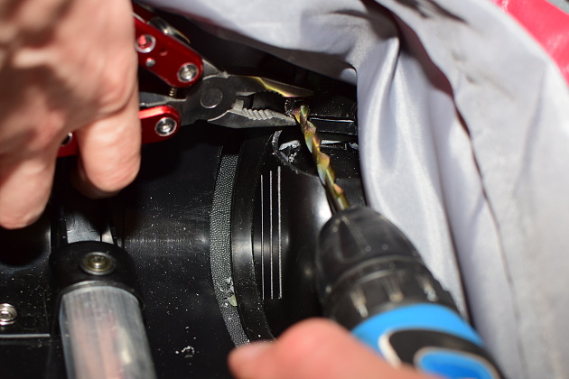 Vrták přiložíme na závěrnou hlavu nýtku a začneme vrtat. Pokud se nýt začne protáčet, zamezíme otáčení uchycením hlavy nýtu do kleští. Chce to trochu cviku a trpělivosti. Po čase vrtání by hlava nýtku měla odpadnout. Nýtek pak vytlačíme ven. Stejný postup opakujeme pro všechny nýtky, které potřebujeme odvrtat.
