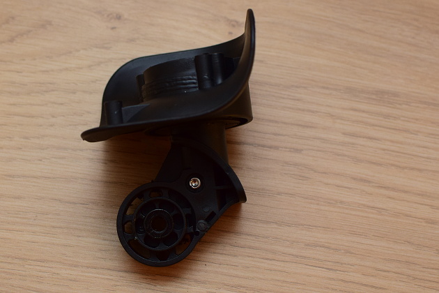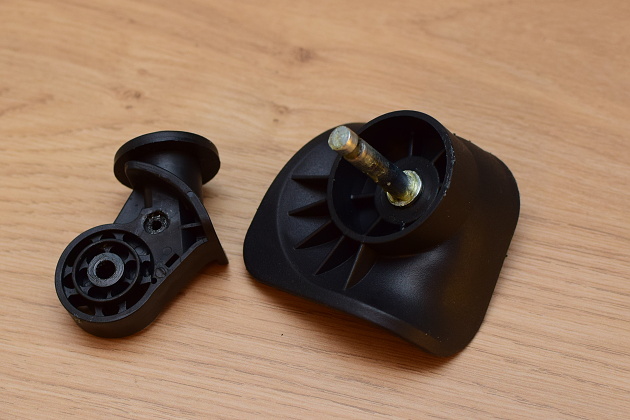 Plastový držák dvojitého kolečka je připevněn na kovovém montážním trnu a zajištěn nýtkem nebo kolíkem. Kolík či nýtek může být viditelný nebo schovaný za kolečkem. Držák může být poškozen či ztracen. Naštěstí i takto rozbitý kufr lze opravit.