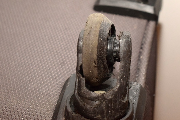 Nové kolečko vložíme na místo původního a uchytíme ho pomocí nové šroubovací osičky. Pokud by kolečko někde drhlo o držák, může pomoci umístit na obě strany mezi držák a kolečko podložky.